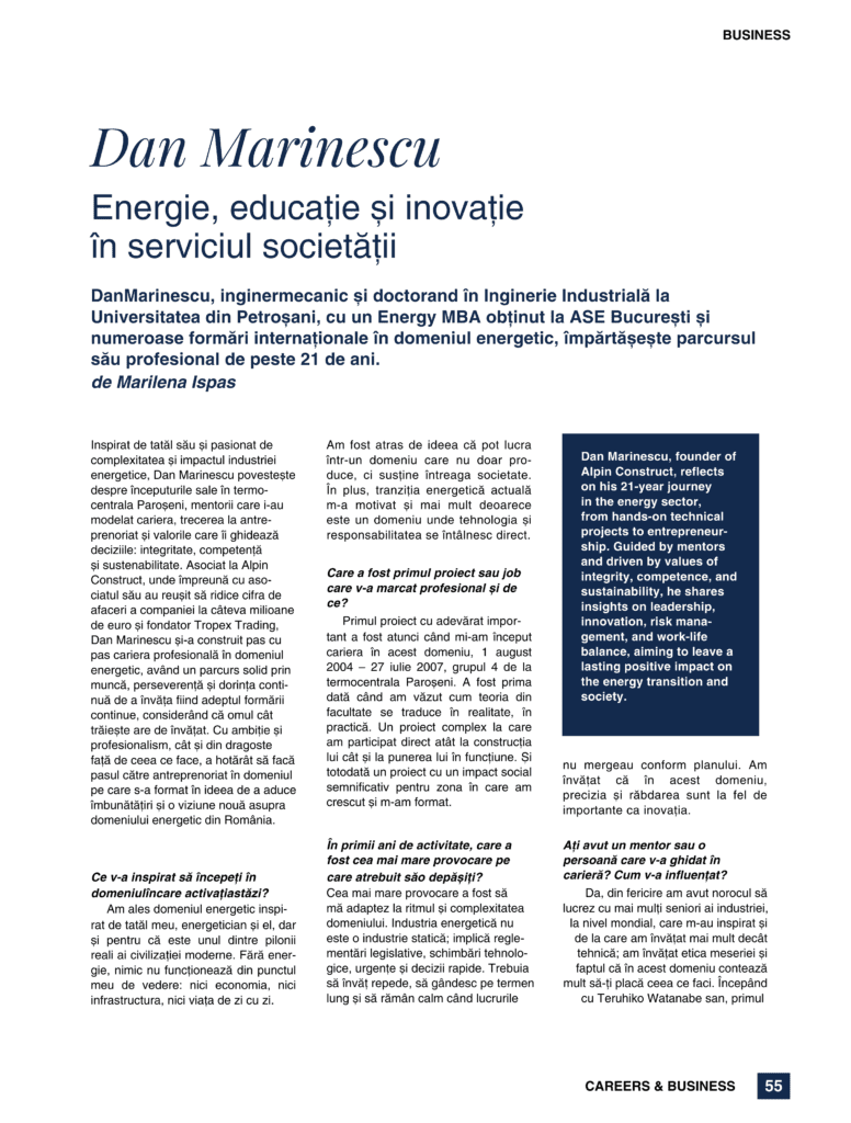 Inspirat de tatăl său și pasionat de complexitatea și impactul industriei energetice, Dan Marinescu povestește despre începuturile sale în termocentrala Paroșeni, mentorii care i-au modelat cariera, trecerea la antreprenoriat și valorile care îi ghidează deciziile: integritate, competență și sustenabilitate. Asociat la Alpin Construct, unde împreună cu asociații săi au reușit să ridice cifra de afaceri a companiei la câteva milioane de euro și fondator Tropex Trading, Dan Marinescu și-a construit pas cu pas cariera profesională în domeniul energetic, având un parcurs solid prin muncă, perseverență și dorința continuă de a învăța, fiind adeptul formării continue, considerând că omul cât trăiește are de învățat. Cu ambiție și profesionalism, dar și din dragoste față de ceea ce face, a hotărât să facă pasul către antreprenoriat în domeniul pe care s-a format, în ideea de a aduce îmbunătățiri și o viziune nouă asupra domeniului energetic din România.