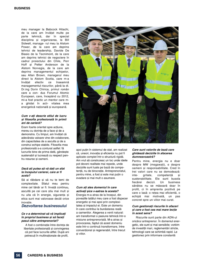 Dan Marinescu: Energia m-a atras de la început, din povestea tatălui meu care a fost dispecer energetic și mai apoi prin complexitatea și impactul ei. Este un domeniu în care contribui la bunăstarea reală a oamenilor. Alegerea a venit natural: am transformat o pasiune tehnică într-o misiune antreprenorială. M-a atras și provocarea, faptul că acest domeniu este într-o continuă transformare, între convențional și regenerabil, între trecut și viitor.