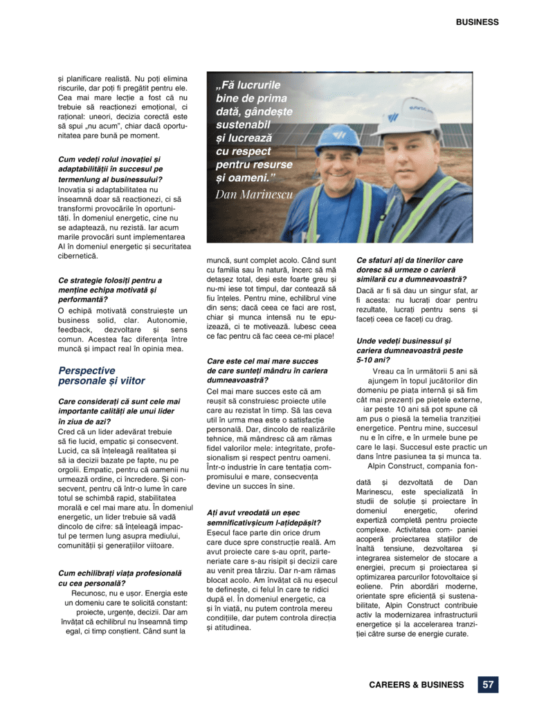 Dan Marinescu: Eșecul face parte din orice drum care duce spre construcție reală. Am avut proiecte care s-au oprit, parteneriate care s-au risipit și decizii care au venit prea târziu. Dar n-am rămas blocat acolo. Am învățat că nu eșecul te definește, ci felul în care te ridici după el. În domeniul energetic, ca și în viață, nu putem controla mereu condițiile, dar putem controla direcția și atitudinea.