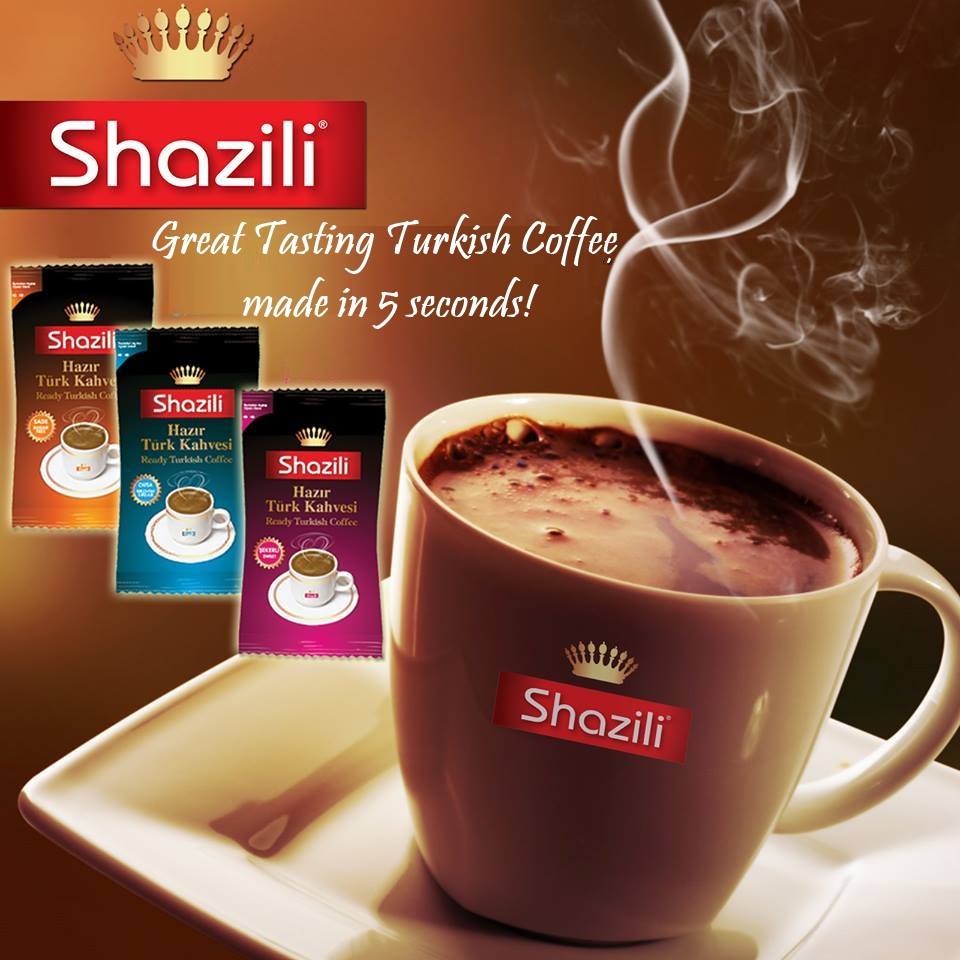 Numele brandului “Shazili“ este dat de Şeicul “Şazili“ care a trăit în Yemen, la sfârşitul secolului al XIV-lea, şi despre care se spune că ar fi prima persoană care a băut cafea. Pentru a nu pierde gustul şi aroma cafelei autentice turceşti am adaptat procesul de preparare la condiţiile zilelor noastre. Astfel, în urma unor studii efectuate pe mai mulţi ani de zile, Cafeaua Shazili a găsit formula perfectă pentru a oferi acelaşi gust, miros şi aspect în doar cinci secunde. Brandul „Shazili Ready Turkish” aduce cafeaua turcească pe piaţă fără a-i compromite gustul şi aspectul, indiferent de persoana care o prepară. De acum poţi savura cafeaua turcească la birou, în avion, în cafenele, sau în maşină, fără niciun efort.